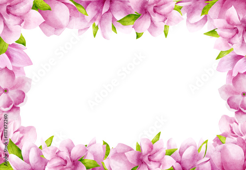 Rectangular frame of beautiful pink magnolias with leaves. Watercolor illustration. Rectangular template, blank for text, on white background