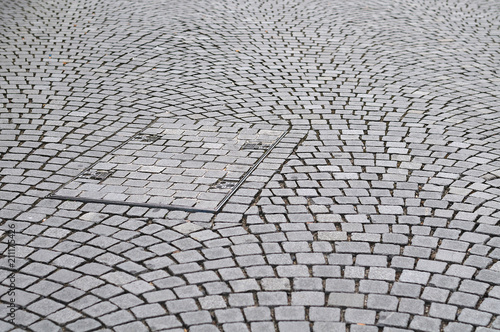 rectangular manhole in sett stone pavement