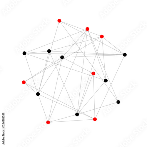 Red and black nodes connected by lines, simple isolated abstract pattern. Network visualization showing interconnected data points. Showcasing complexity through simplicity.