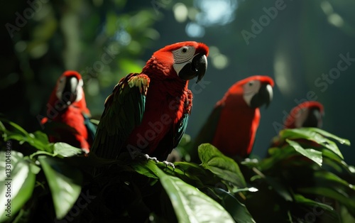 Red and Green Macaws on Lush Tropical Foliage