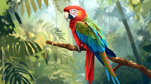 Red and green parrot perched on a branch. Amazon Rainforest. Illustration