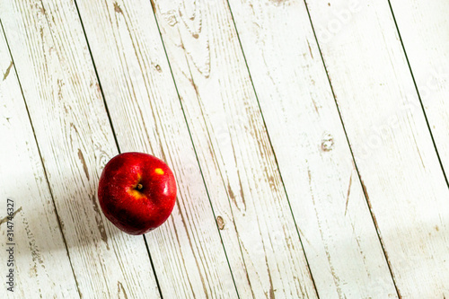 Red apple on wooden background on teh left