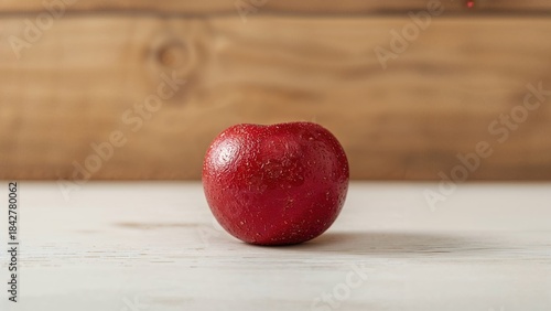 Red apple placed on a light-colored surface with a wooden background.