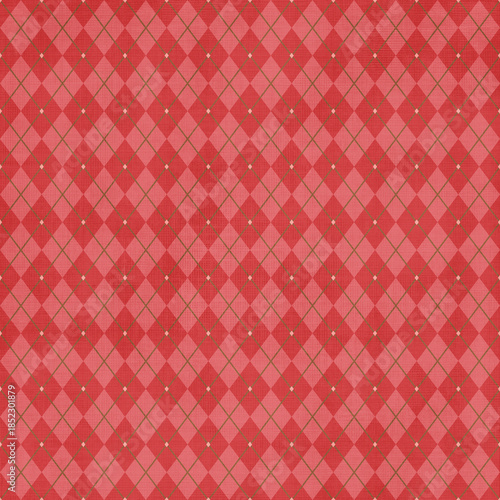 Red argyle diamond pattern with green diagonal stitching lines. Seamless classic background ideal for holiday designs, textiles, and wrapping paper.