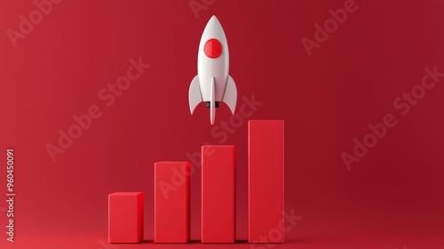 Red bar graph with a rocket soaring upwards, representing rapid progress, 3D illustration