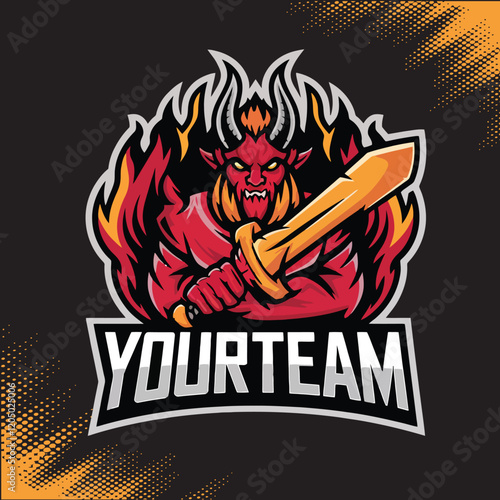 Red Devil With Sword Mascot Team Esports Logo Vector Illustration