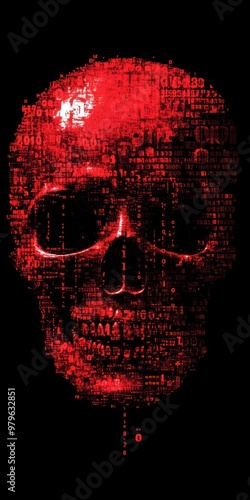 Red digital skull composed of code on black background