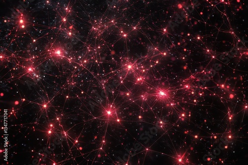 Red glowing network nodes connect on black, fine white dots present. Use for tech, AI, neural networks, connections, or deep space concepts.
