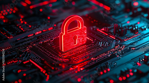 Red Glowing Padlock Icon on Circuit Board Representing Cybersecurity and Data Protection in Digital Technology Environment