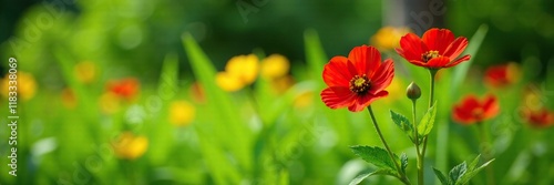 Red nasturtium in a garden bed among green grass, landscape, red, garden
