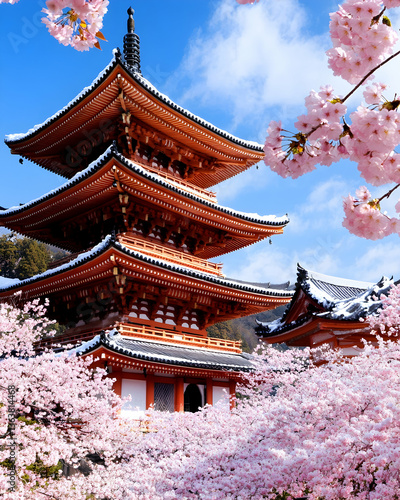Red pagoda amidst vibrant cherry blossoms under a clear sky
