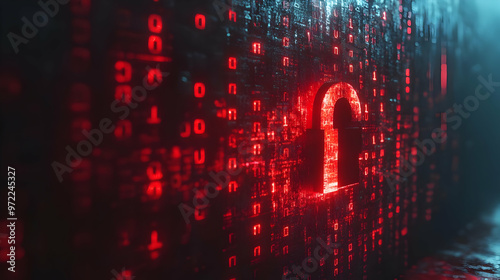 Red Unlocked Padlock on Digital Binary Code Background