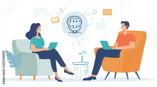Remote work communication, collaboration illustration with laptop and brainstorm
