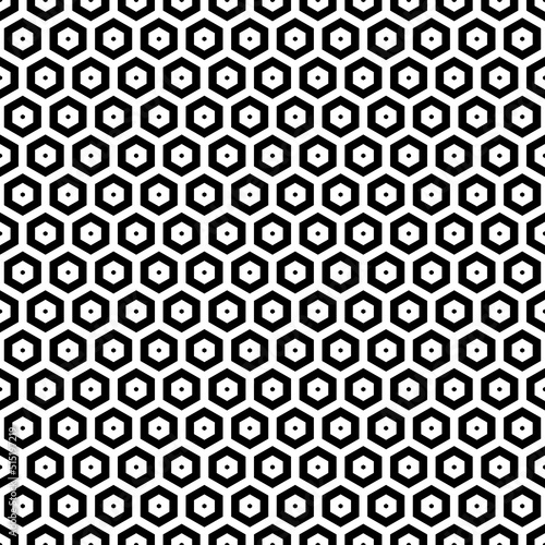 Repeated black figures on white background. Honeycomb wallpaper. Seamless surface pattern design with regular hexagons. Polygons motif. Digital paper for page fills, web designing, textile print.