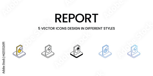 Report Icon Design in Five style with Editable Stroke. Line, Solid, Flat Line, Duo Tone Color, and Color Gradient Line. Suitable for Web Page, Mobile App, UI, UX and GUI design.