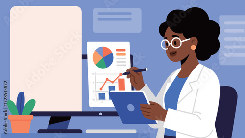 Researcher analyzing data on a computer screen and tablet with charts and graphs