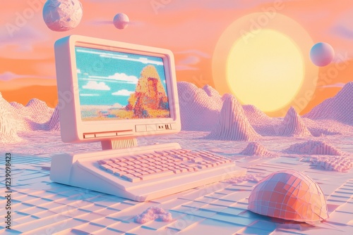 Retro Computer Displaying Ancient Landscape In Surreal Setting