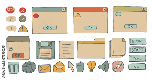 Retro pc elements, user interface, operating system, windows, icons in trendy retro style. old computer ui elements dialog boxes vector set. Illustration 90s. Vector illustration