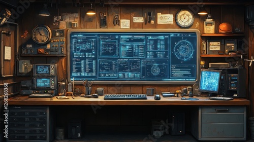 Retro tech workbench, digital interface, cluttered workshop, data analysis