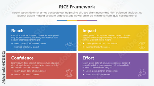 RICE scoring model framework infographic concept for slide presentation with big rectangle box with matrix structure with 4 point list with flat style