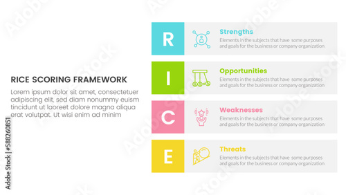 rice scoring model framework prioritization infographic with vertical square box information concept for slide presentation