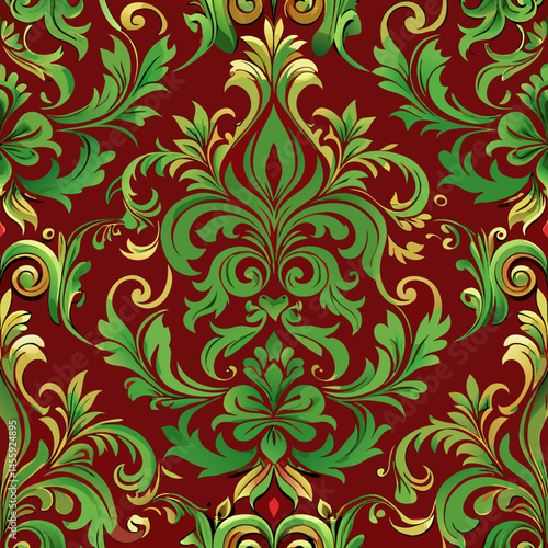 Rich Brocade Vector Pattern in Baroque Style with Green and Gold, seamless vector pattern