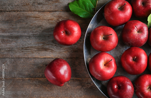Ripe red apples on wooden table