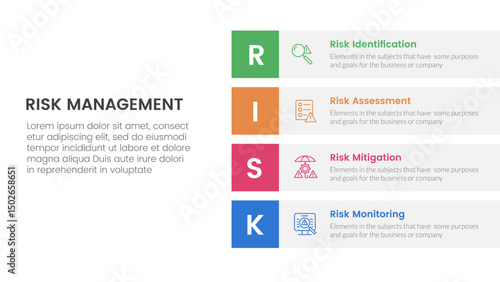 risk management infographic with 4 point stage template with vertical stack rectangle box description for slide presentation