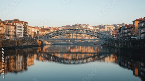 River Bridge Reflecting Cityscape Buildings At Sunset