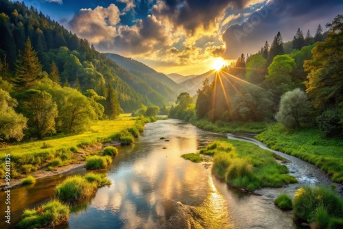 River flows gently through serene valley surrounded by lush green forests under warm golden morning light.