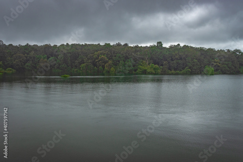 river serene back water with forests and dramatic cloudy sky