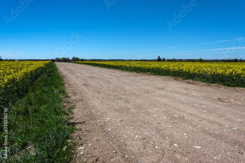 Road between blooming canola fields.