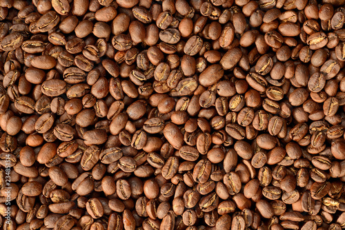 Roasted brown coffee beans pattern, background, top view
