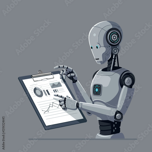 Robot analyzing data on a clipboard in a minimal and modern style vector art