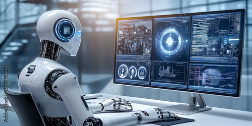 Robot analyzing data on a multi-screen display, symbolizing advanced technology and automation in a modern office environment. Artificial intelligence working.