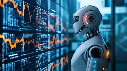 Robot Analyzing Stock Market Data on Multiple Screens Future Technology