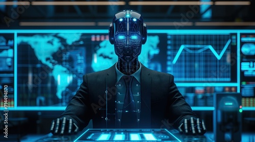 robot artificial intelligence successful businessman. sit Dressed suit and tie in the room office.