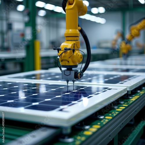 Robot assembling solar panel. A robotic arm precisely positions components on a solar panel during automated manufacturing.