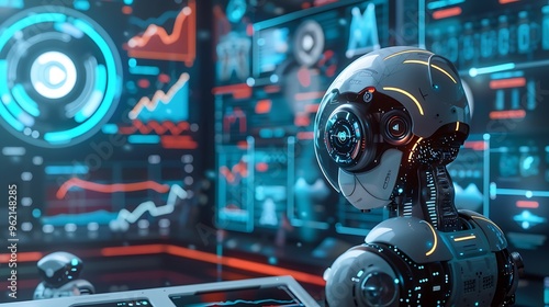 Robot body stands in front of a screen filled with complex algorithms and data charts.