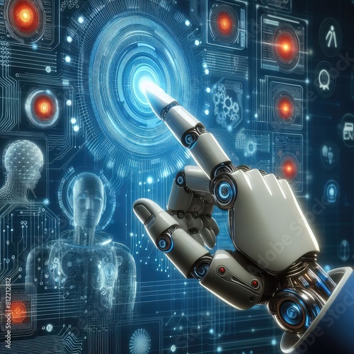 Robot hand touching big virtual data network servers with artificial intelligence concept