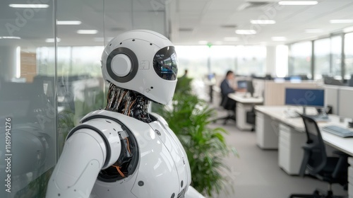 Robot interaction in modern office environment business setting digital technology contemporary design high-tech workspace