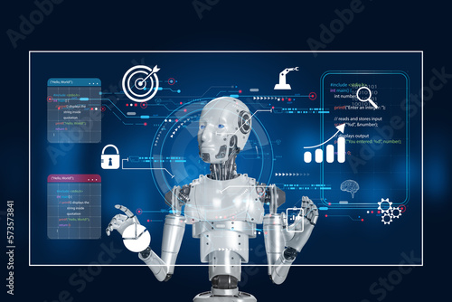 robot programmer that uses artificial intelligence in data processing programming digital technology with a large database Software development and coding technology with HTML, PHP and JavaScript.