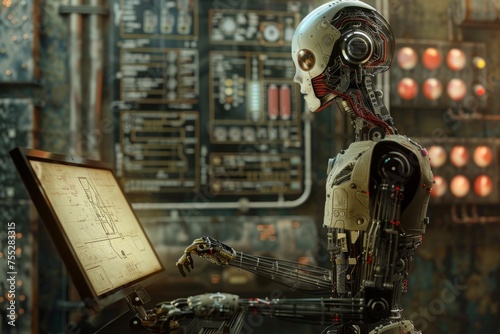 Robot studying engineering schematics - Intricate robot attentively analyzing engineering schematics on a digital display in a workshop setting