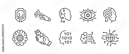 Robot technology icons. Set of 10 AI technology minimal icons. Brain, Microchip, AI Interface, Robotics, Binary Code icon. Design signs for web page, mobile app, packaging design. Vector illustration