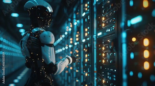 robot wallpaper as a data center guard, server, digital security guard, from data theft by hackers, data security by intellectual intelligence 16:9, HD