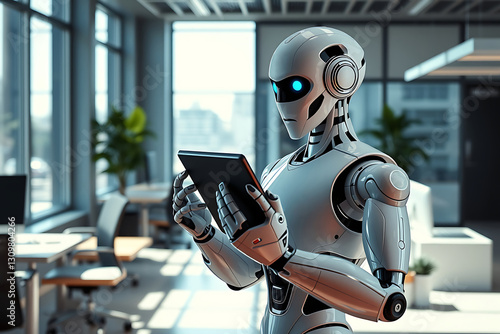 robot with a tablet in an office, humanoid Robot assistant analyzing data in modern office environment.