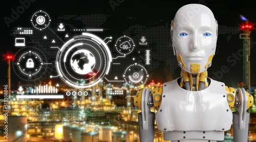 Robot with artificial intelligence, infographic of technology networks, 3D Rendering