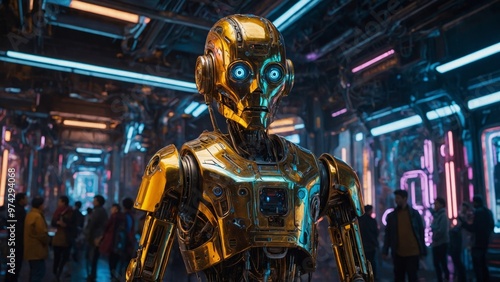 robot with golden glowing lights in dark