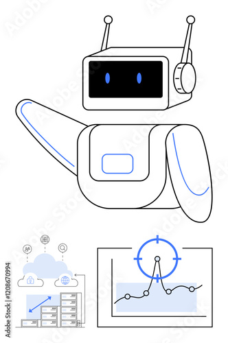 Robot with screen face and antennas interacts with analytics chart and cloud data platform. Ideal for AI, machine learning, automation, innovation, cloud computing, data-driven insights, abstract