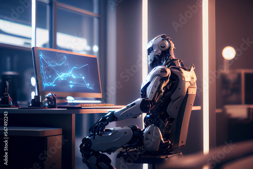 Roboter mit künstlicher Intelligenz sitzt im Büro vor einem Computer - Generative Ai